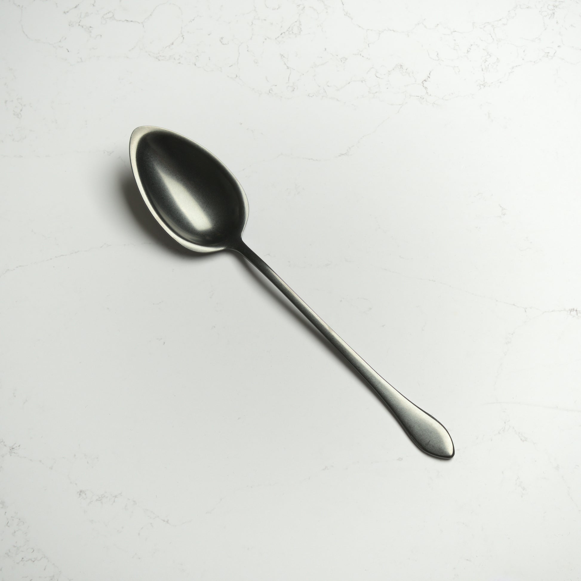 Inspired by the worn and tarnished steel often found at flea markets, and modeled after old American and European silhouettes, the spoon is tumbled and unpolished. This creates a matte and imperfect material finish. Each piece is stamped and etched, then finished by hand on a lathe in Mr. Okada’s workshop.