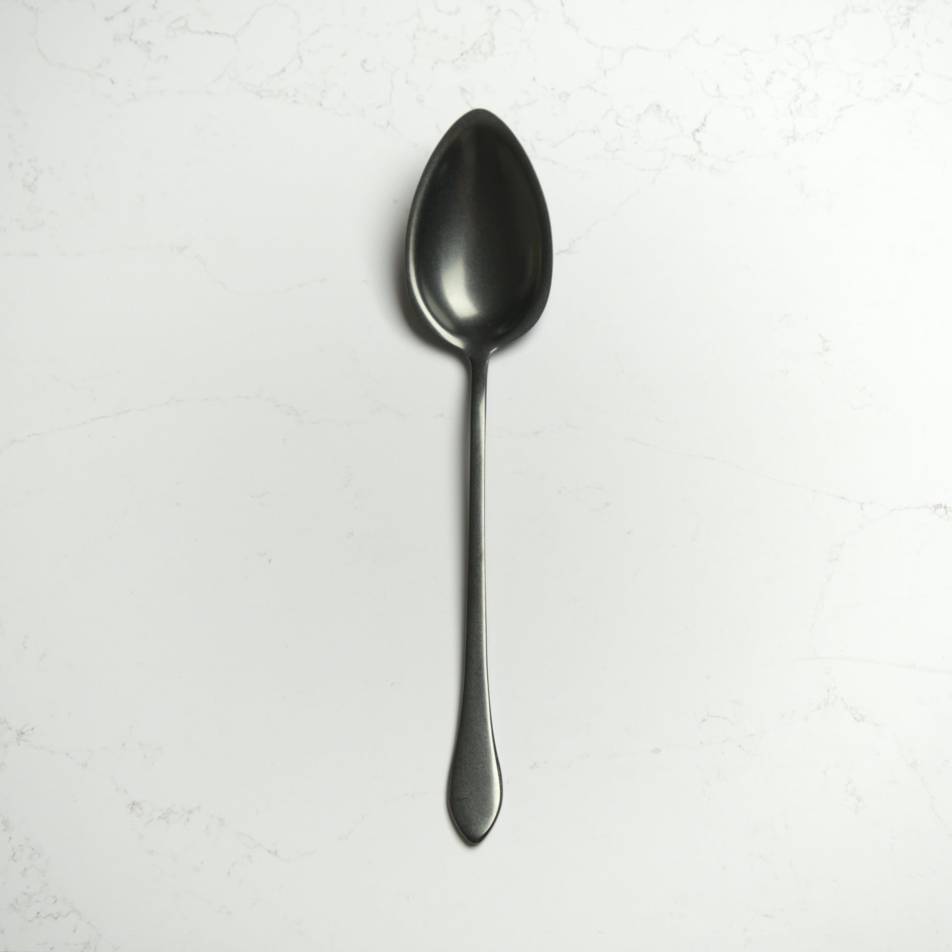 01 Gunmetal is built with a single tablespoon volume (15 ml / 0.5 oz) to scale recipes and ratios with consistency. The well is deeply formed to cradle liquid, the tip is tapered to a fine point for precise pouring or basting. The handle is long enough to stir a braise or a pot of beans, and nimble enough to sauce a plate. The lip is thin and flared to help scrape the corners of a pan or storage container.