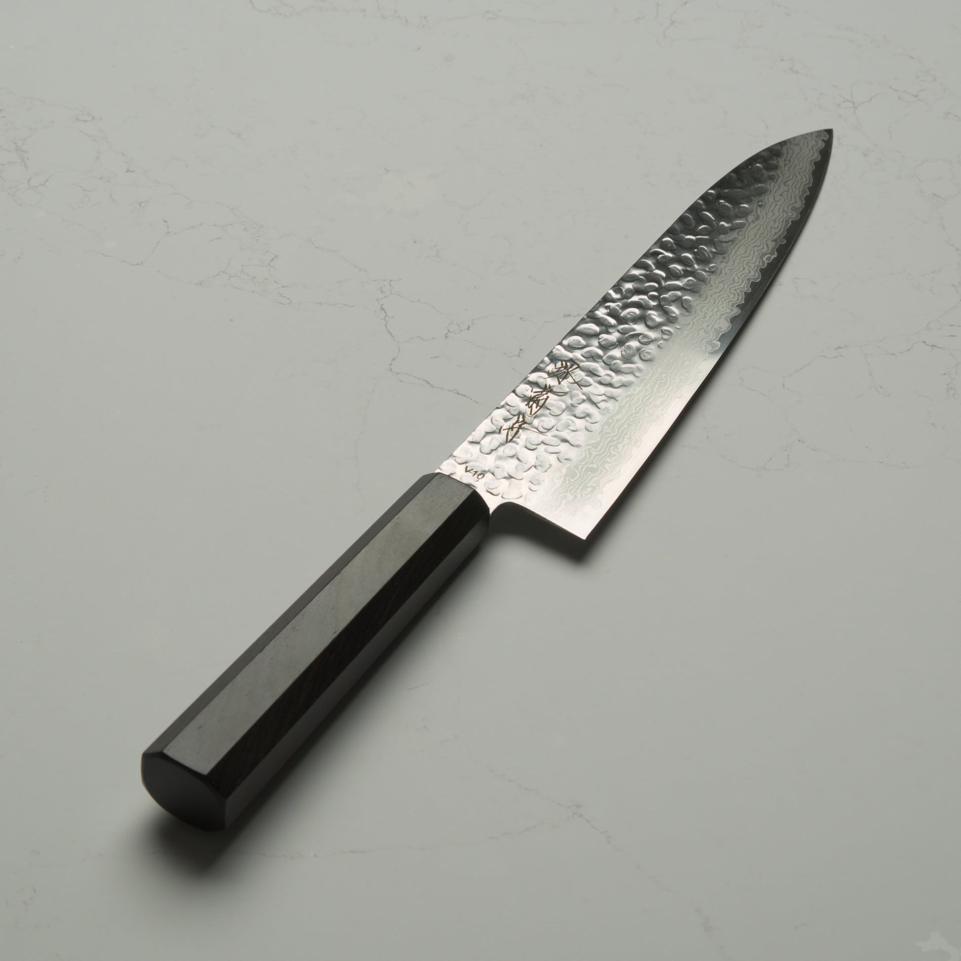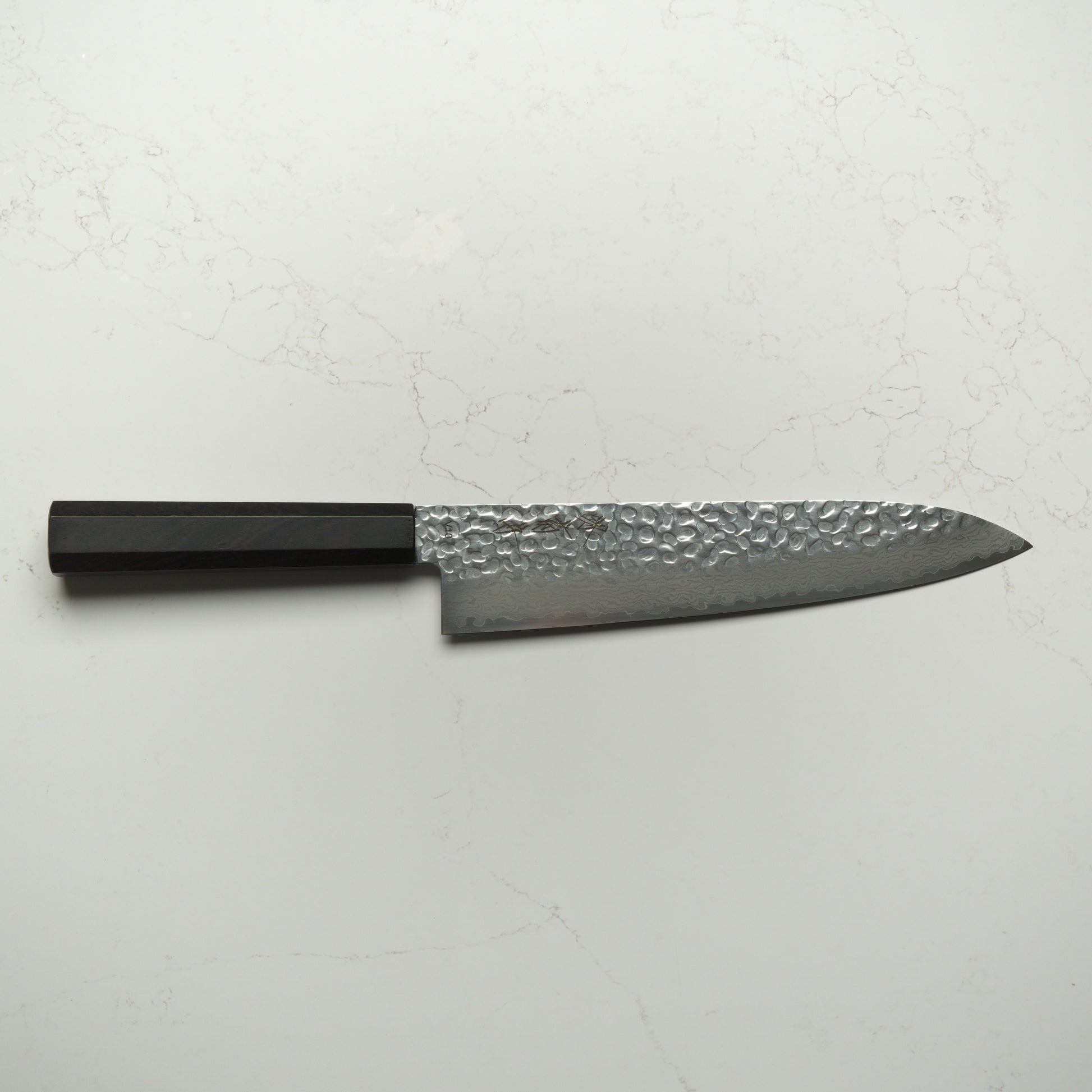 At its core is VG10 stainless steel, heat treated for a stable, responsive edge that sharpens easily and holds well through regular use. The stainless damascus cladding adds toughness and visual depth, while the tsuchime hammer finish helps reduce food sticking during prep.